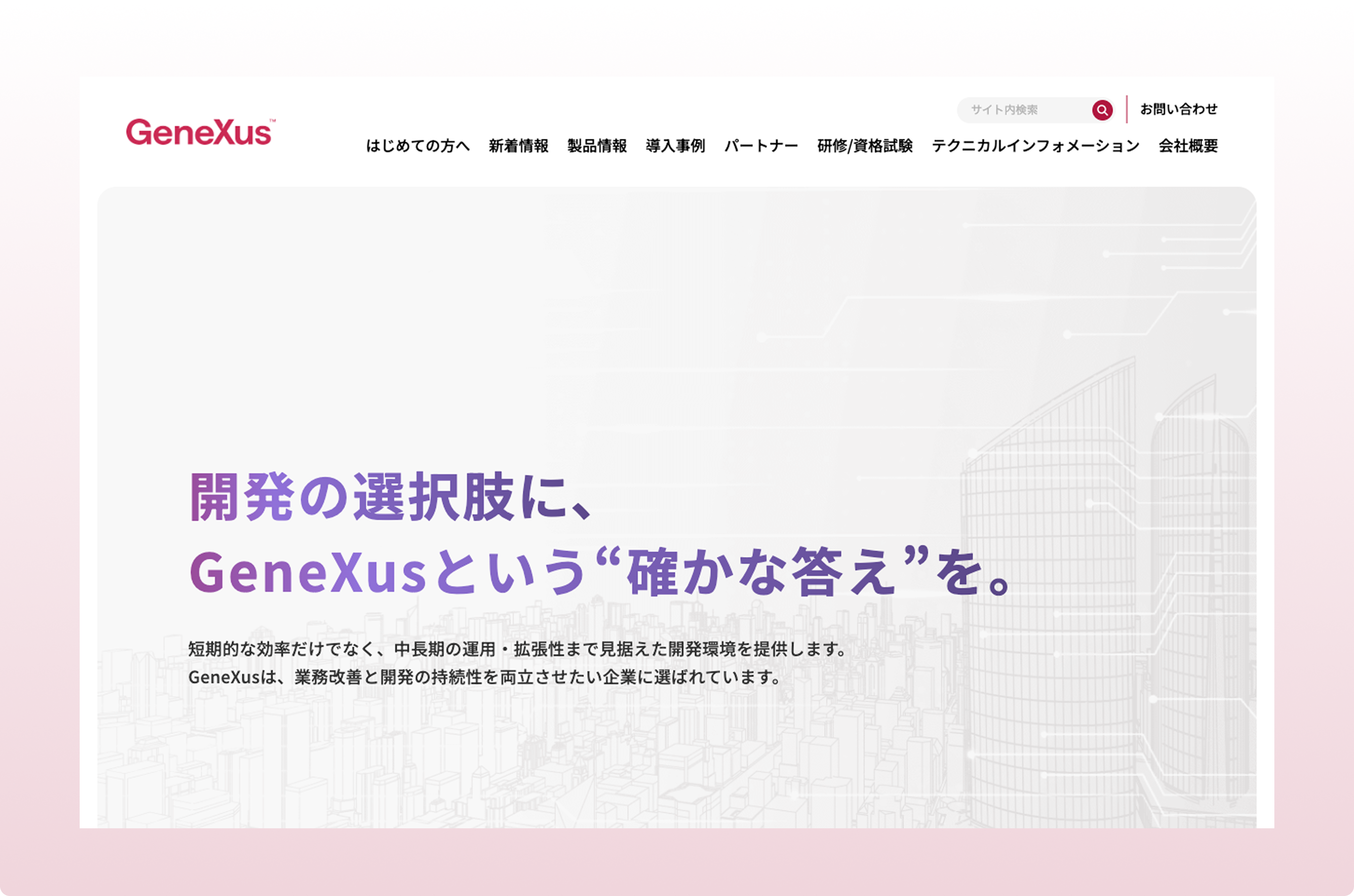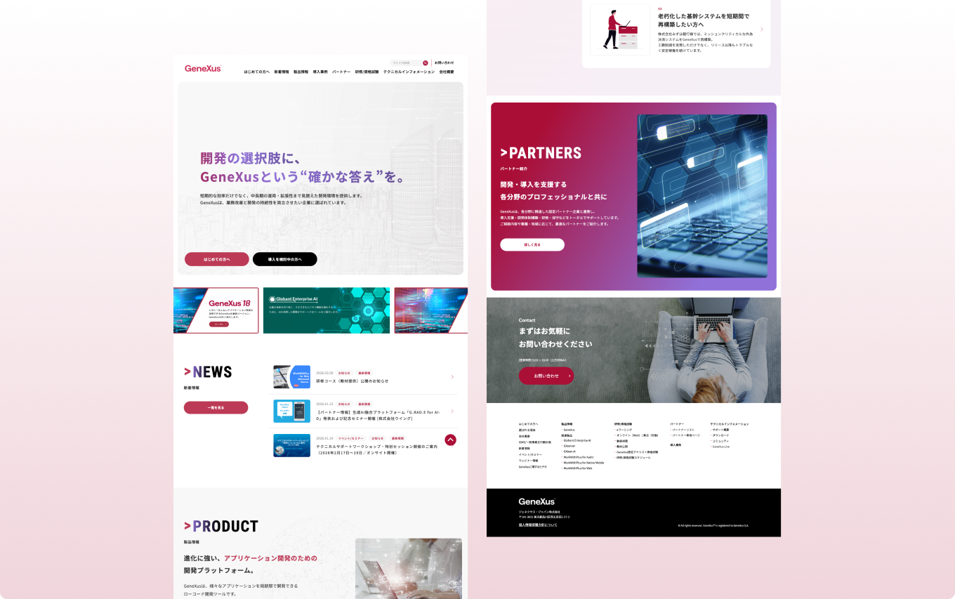 現行サイトのデザインや導線の分かりにくさを改善し、新規ユーザーがGeneXusの価値を理解しやすい構成へ刷新することを目的としたリニューアルを実施しました。トップページは情報の優先順位を整理し、視認性と訴求力を高めたデザインへ再構築しています。