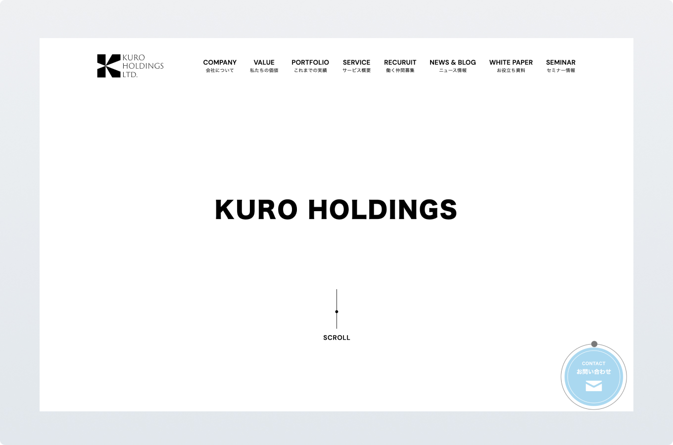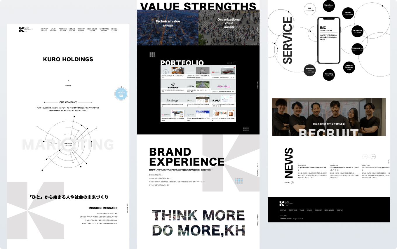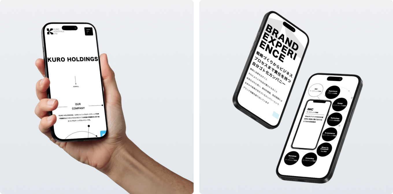KURO HOLDINGS株式会社様の自社ブランディングを目的としたコーポレートサイトを制作しました。モノトーンを基調としたデザインで、洗練された企業イメージと創造的な思考を両立。ブランドコンセプトである“アーキテクト感”を、デザインと動きで具現化しています。